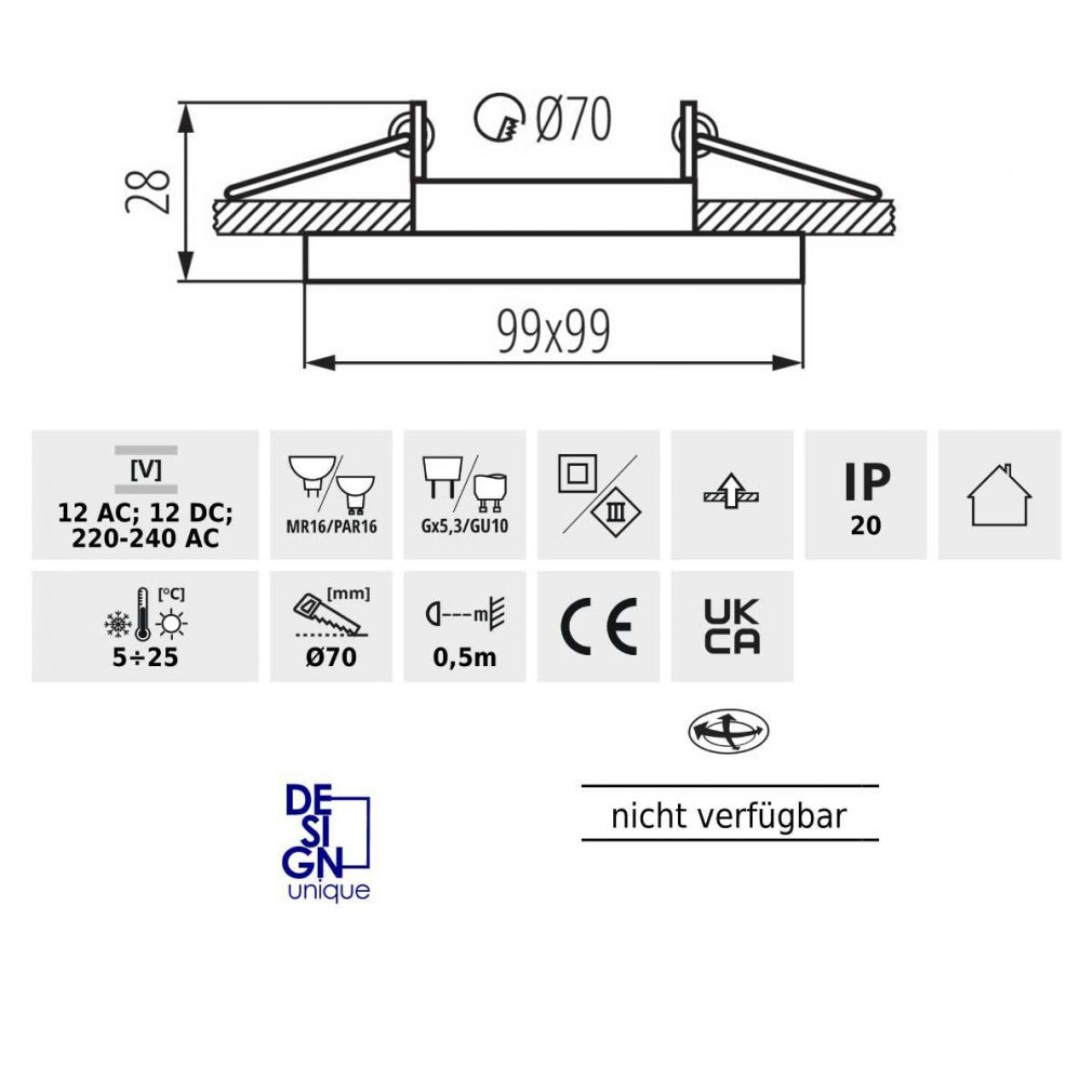 Leuchtmittel: geeignet für LED oder Halogenlampen MR16 oder JDR = 50mm